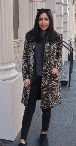 This outfit is perfect for those breezy travel days when you want comfort without sacrificing style. The leopard print overcoat is your secret weapon against the chill, while the cozy gray sweater keeps things relaxed.