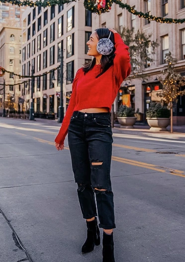 Red Cropped Sweater + Baggy Black Jeans + Black Ankle Boots