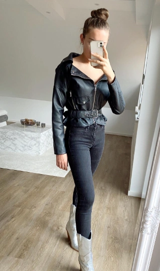 A sleek look of chic jeans paired with a fitted cropped top, layered with a stylish leather jacket. This outfit is perfect for transitioning from day to night. The high heels elevate the outfit while the mini tote adds a touch of sophistication.