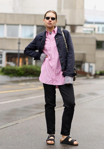 Think of your favorite black jeans as the ultimate canvas; they effortlessly harmonize with a chic navy denim jacket and a playful pink button-up shirt. This outfit not only offers comfort but also showcases a stylish edge, perfect for brunch or casual outings. The slide sandals add a touch of relaxed flair, making it ideal for those spontaneous adventures.