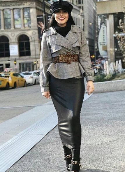 The textured purple turtleneck adds a pop of color, while the sleek gray checkered pencil skirt hugs your curves beautifully. Complete your look with elegant nude heels for an effortlessly polished vibe.