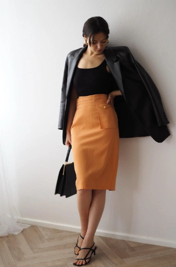The sleek orange skirt hugged her curves perfectly, while the black ribbed tank top created a chic contrast. Paired with a stylish black leather blazer, this look transitions effortlessly from day to night. The addition of strappy heels elongates her figure, making it ideal for both office meetings and evening outings.