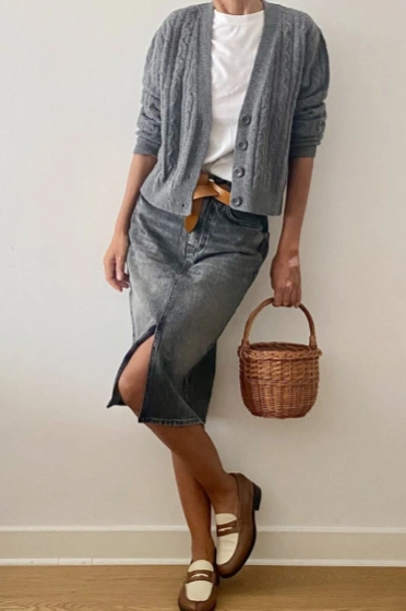 This outfit features a cozy gray cable knit cardigan layered over a classic white tee, paired with a chic denim pencil skirt that adds a modern twist. The brown Mary Jane flats provide comfort without sacrificing style, while the woven tote bag completes the look, making it perfect for carrying essentials.