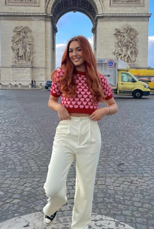 The playful red heart crop top adds a touch of whimsy, perfectly balancing the elegance of cream wide-leg trousers. Comfortable black sneakers ensure you can dance the night away while keeping your style on point.