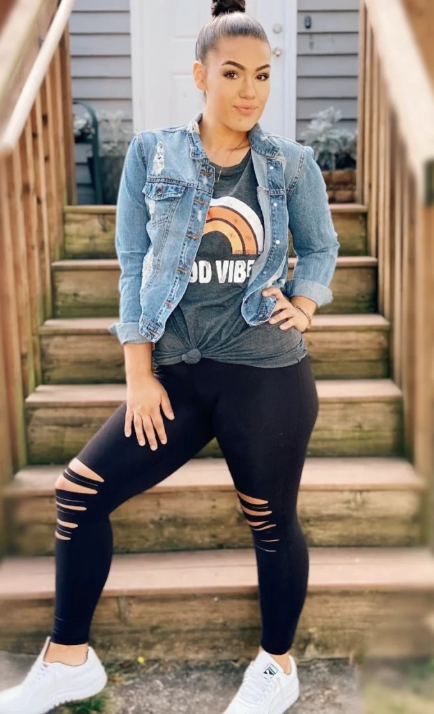 When it comes to fashion versatility, outfits to wear with black leggings are like a blank canvas waiting for your personal touch. The “Good Vibes” graphic tee adds a playful flair, while the distressed denim jacket offers a chic layer for cooler days. Ripped black leggings not only provide a trendy edge but also ensure all-day comfort. Paired with crisp white sneakers, this look is perfect for running errands or casual outings, making it a must-have in your wardrobe.