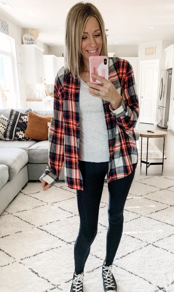 The cozy flannel shirt, adorned in vibrant red and blue checks, adds a warm touch, while the soft white tee provides a breathable base layer. The sleek black leggings hug your curves, offering both flexibility and support, making them perfect for any activity. Complete the look with casual sneakers for an effortlessly chic vibe that transitions seamlessly from lounging to outings.