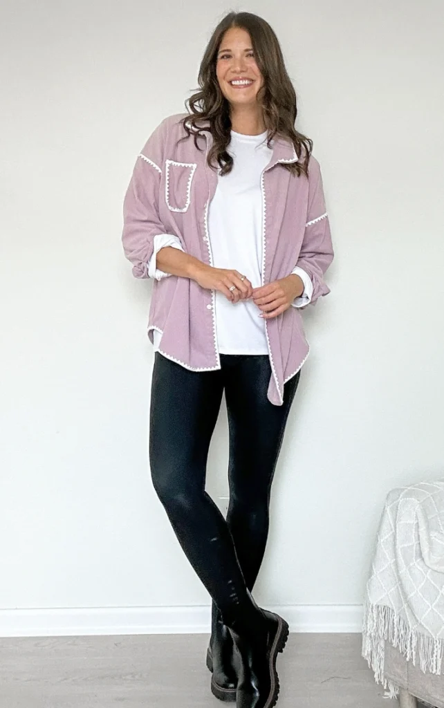 Black Leggings + White Tee + Lilac Oversized Jacket + Black Chelsea Boots