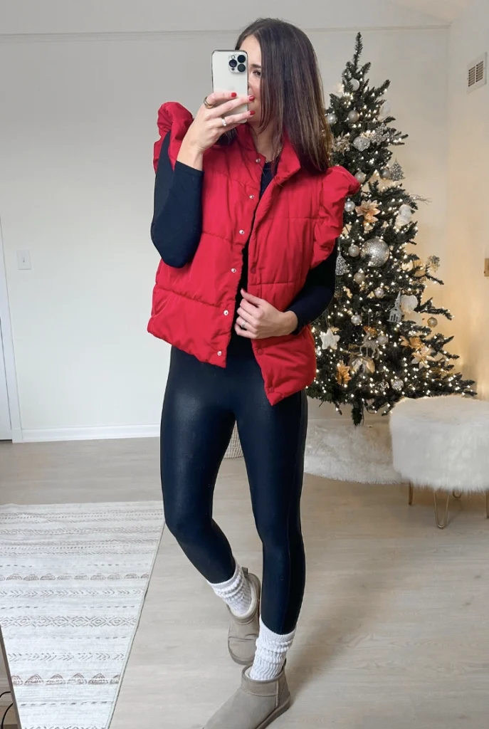 This outfit, featuring a playful red puffer vest and soft cream knit socks, is perfect for leisure and comfort. The leggings offer a flattering fit, while the ankle boots add a chic touch, making it easy to transition from a casual gathering to a festive evening out.