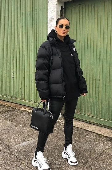 The shiny black puffer jacket adds an edgy flair, while the cozy brown sweater dress brings warmth and texture. Paired with sleek black flared leggings and trendy sneakers, this look is perfect for any casual outing. A stylish handbag completes this ensemble, ensuring you look fashionable and feel confident as you step out into the world.